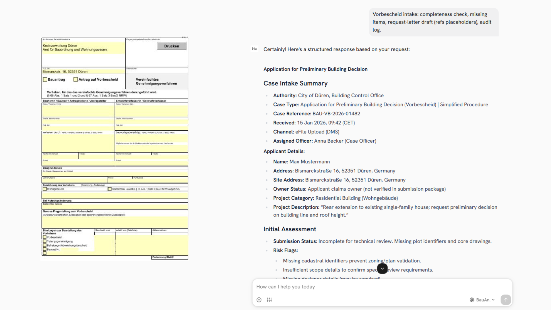 Beantwortet Standardanfragen mit Quellenverweis, erstellt Bescheid-Entwürfe zur Prüfung und eskaliert Sonderfälle an Sachbearbeiter.