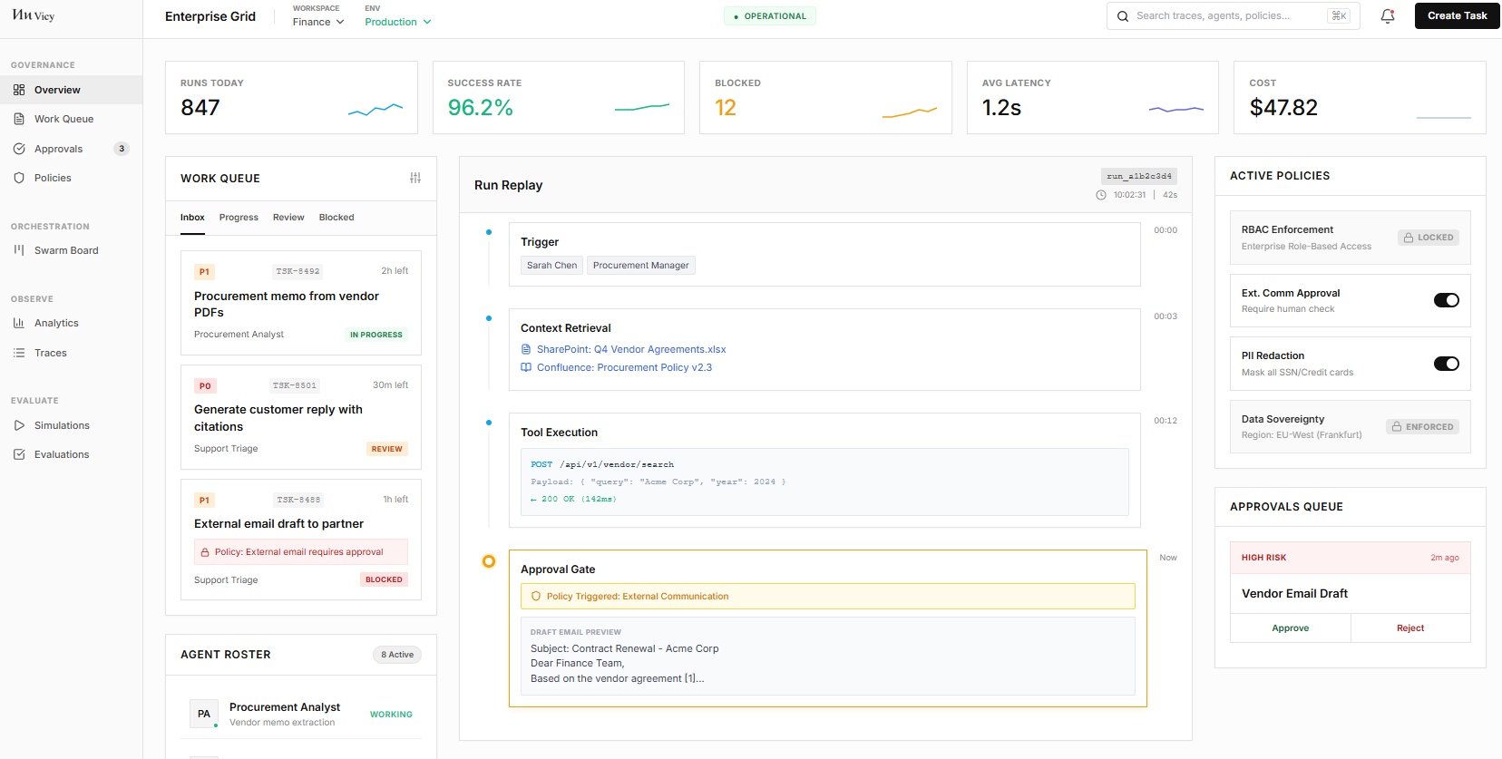 Hochspezialisierte vertikale Agents von globalen Anbietern – sicher integriert unter Vicy-Governance.